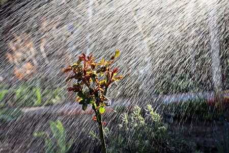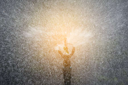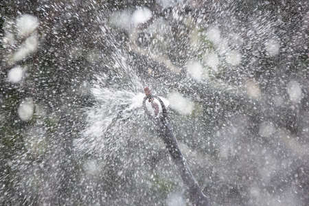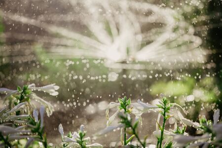 Abstract water background. Garden irrigation system sprays jets of water in a chaotic manner