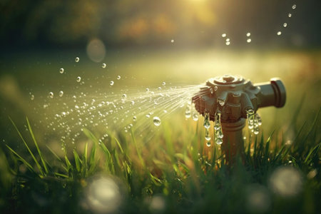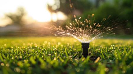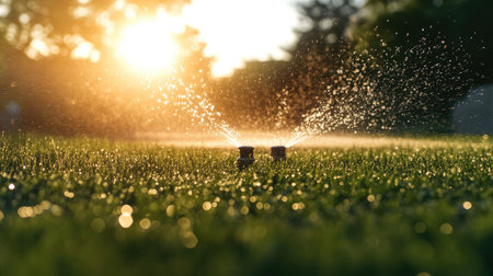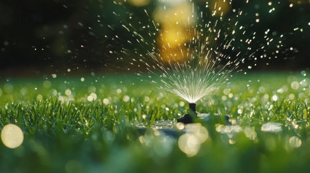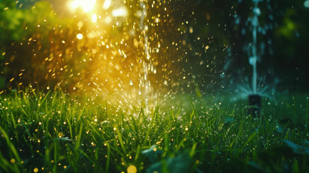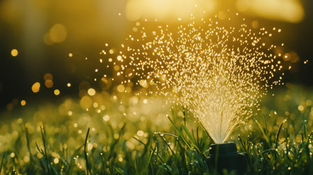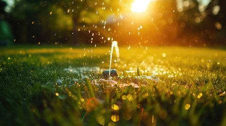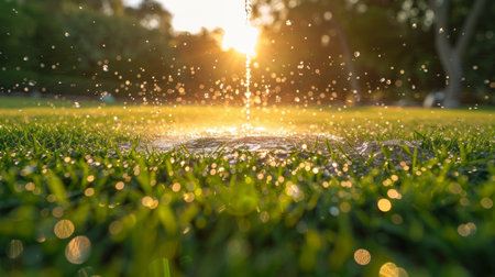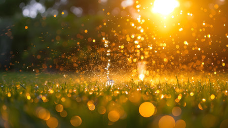 Captivating image of water spraying on green grass during sunset, illuminated by soft sunlight. The bokeh effect enhances the serene atmosphere.