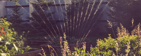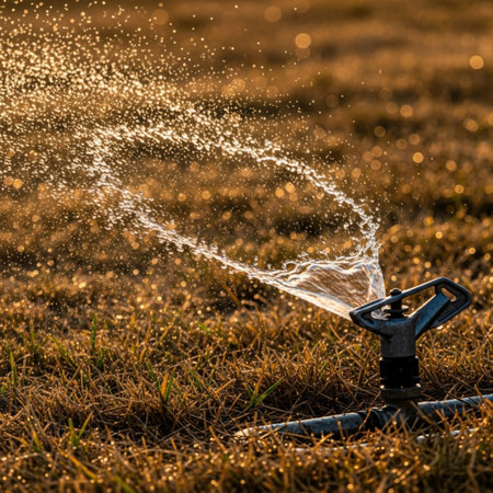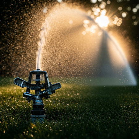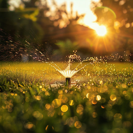 Automatic sprinkler spraying water across a lush green lawn in the early morning light, droplets catching the sun.