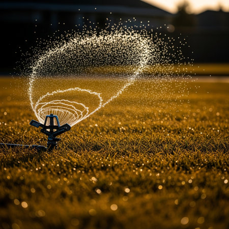A captivating image of a sprinkler spraying water in a green field, illuminated by golden hour light, showcasing the beauty of nature and agricultural practices.