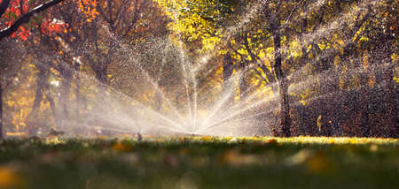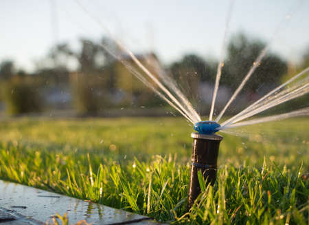 Watering the lawn with automatic irrigation sprinkler at sunset. Lawn care and gardening concept.