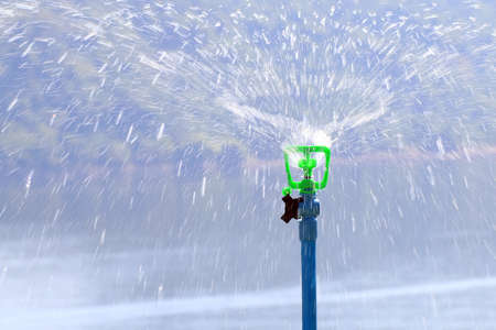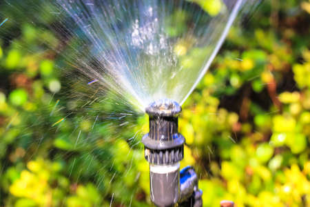 Water splashing from sprinkler. Dots drops on green background. Watering plants tool for ornamental garden. Agriculture, farming concept. Plants care.