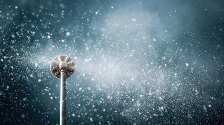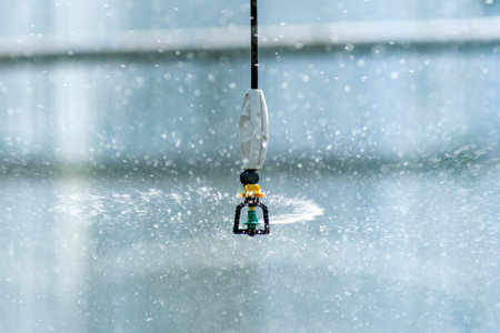 This image captures a detailed view of a water spray nozzle in action, creating a fine mist that enhances visual appeal and atmospheric quality.