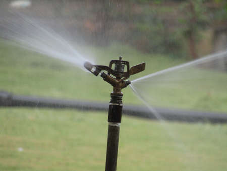 Lawn sprinkler spaying water over green grass. Motion blur. Select focus.