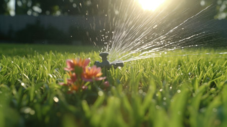 Water sprinkler spraying droplets on a vibrant green lawn with sunflare, symbolizing garden care and summer freshness