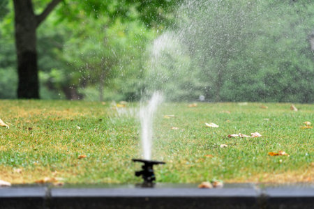A sprinkler system is watering the lush grass, demonstrating effective irrigation and quality garden care