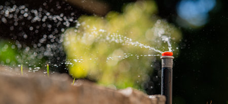 Water splashing from sprinkler. Dots drops on green background. Watering plants tool for ornamental garden. Agriculture, farming concept. Plants care.