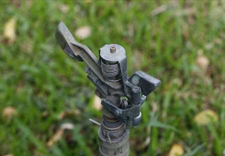 fresh water splash from the sprinkle pole settle in the grass feild in the outdoor garden.