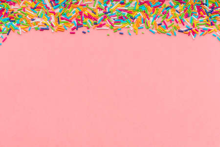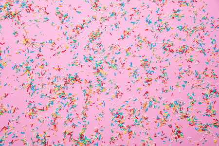 Birthday concept. Colorful sprinkles on pastel pink background, top view