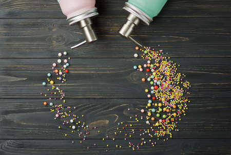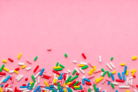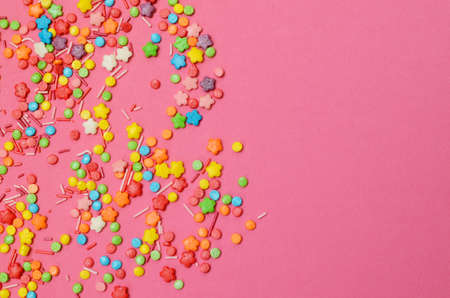 Colorful sugar decor on pink paper, top view flat lay layout. Minimalist trendy background.