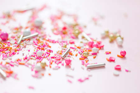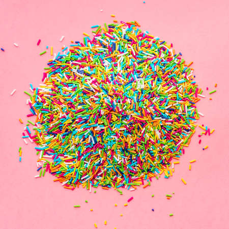 pile of colorful sugar sprinkles on pink background, decoration for ice cream and bakery