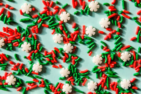 Christmas white snowflakes and red green sugar sprinkles on blue background. Flat lay style. Holiday trendy concept.