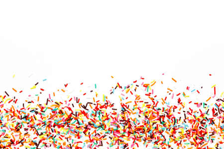 Multicolored Sugar sprinkle dots, decoration for cake, isolated on white. Birthday and holiday background. Flat lay, top view. copy space