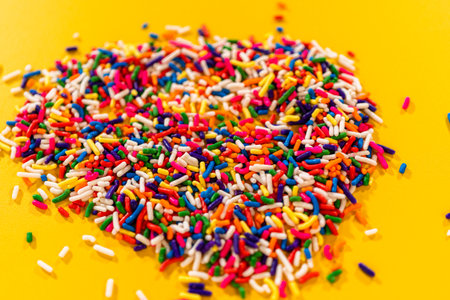 A close-up view of vibrant candy sprinkles scattered on a bright yellow surface. Perfect for backgrounds, party invitations, birthday themes, or dessert advertisements.