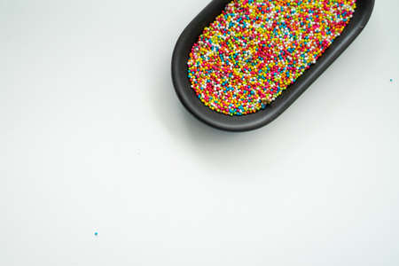 Colourful Sugar sprinkles, decoration for cake and ice-cream and cookies. Top view, Flat lay on white plate.