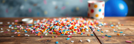 Colorful sprinkles scattered on a rustic wooden table during a festive celebration in a bright indoor setting