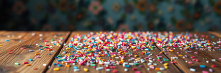 Colorful sprinkles scattered on wooden table with a floral background for a festive atmosphere