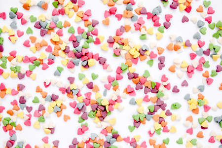 Valentines Day composition. Flat lay, top view of multicolored, colorful hearts texture. Love concept.