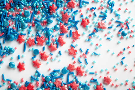 Colourful Sugar sprinkles, decoration for cake, ice-cream and cookies. Top view, Flat lay on white background. Copy space.