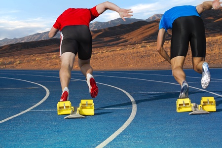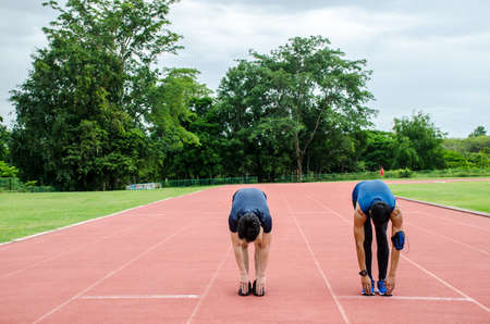 Two sportsman runners on starting position ready for competition in running at the stadium.