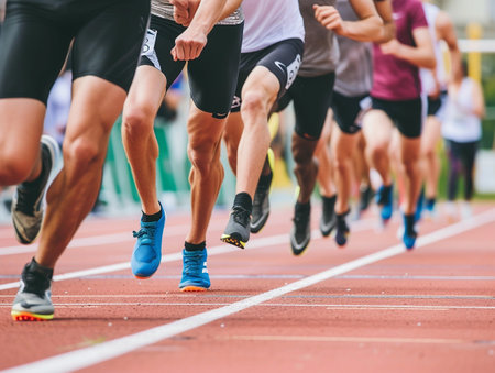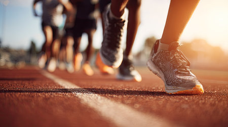 Close-up of runner's feet in sports shoes at track start line. for sports, motivation, new beginnings, fitness goals, and athletic competition themes.
