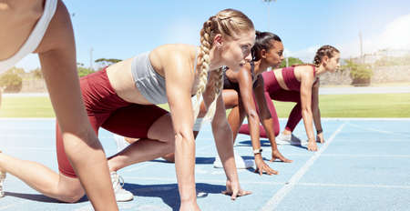 Female runners at the starting line of an race. Athletes kneeling ready to start running. Focused women prepared to compete in a track and field event. Sportswomen on the starting block