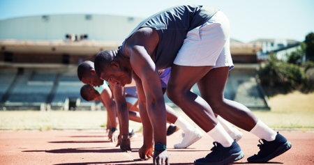 Ready for a run. three handsome young male athletes starting their race on a track.