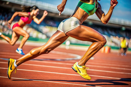 Track athletes in a blur of motion, capturing the intensity of a competitive sprint race.
