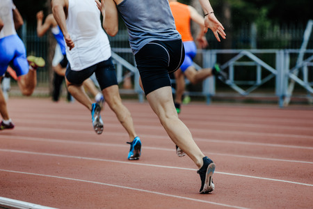 Chelyabinsk, Russia - June 4, 2017: sprinters runners men start running 100 metres during UrFO Championship in athletics