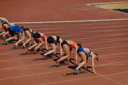 Chelyabinsk, Russia - May 24, 2016: group of girls athletes start to sprint 100 meters during UrFO Championship in athletics