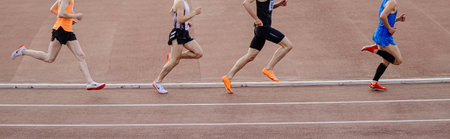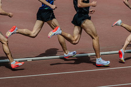 Chelyabinsk, Russia - June 4, 2022: group runners in spikes shoes Nike, Adidas and New Balance running middle distance at stadium during UFD Athletics Championship