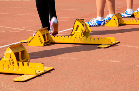 Group of young athletes in starting blocks preparing for a race on outdoor running track