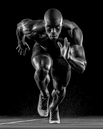 Black and white shot of a male athlete running on a black background