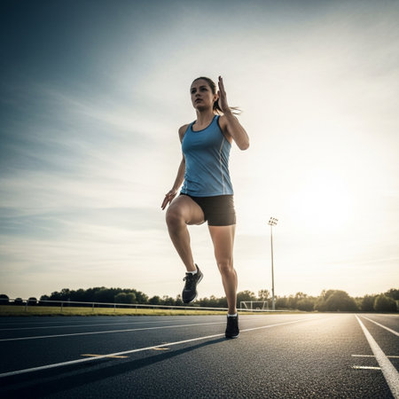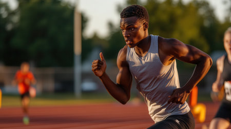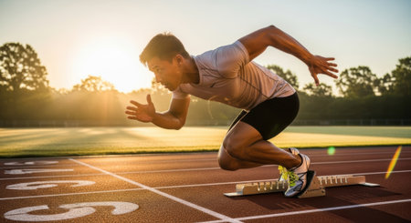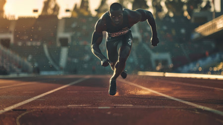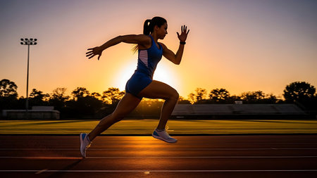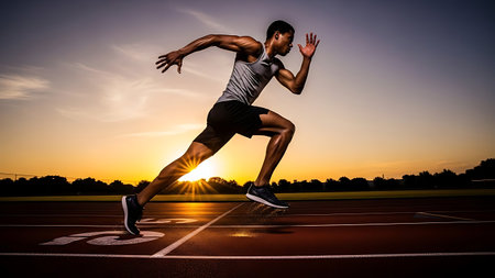 Athlete sprints on track at sunrise: dynamic energy and determination.