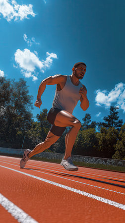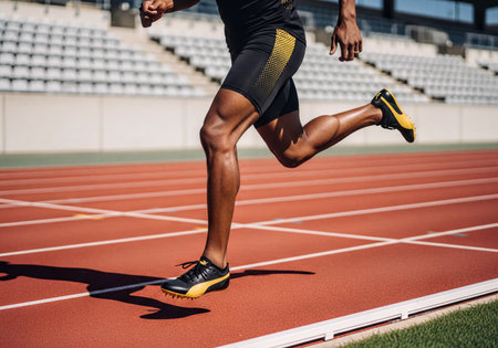 Athlete demonstrates exceptional speed and athletic prowess on an open-air track with powerful stride. Concept of sprint motion, speed training, dynamic strength, and explosive power in action.