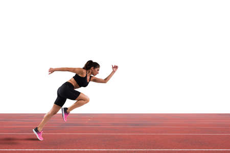 Athlete running on a track and field stadium. Female athlete sprinting towards the finish line.