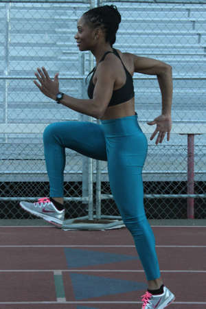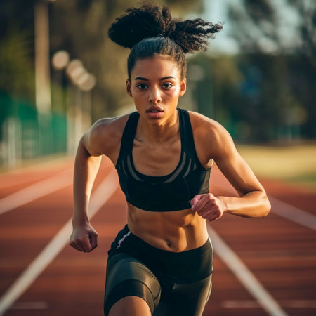 young beautiful african american woman athlete running on athletic race track