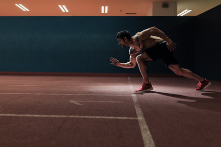 Very fit man on a an indoor track preparing to run