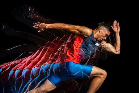Cropped portrait of young athletic man, professional runner isolated over black background. Stroboscope effect.