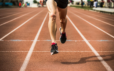 Athlete running on racetrack at stadium. Close up of athlete legs.