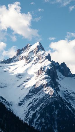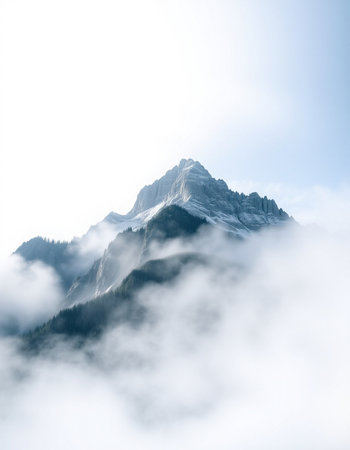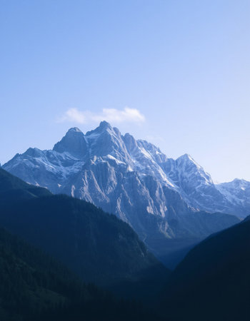 Beautiful mountain landscape with snow-capped peaks in the clouds