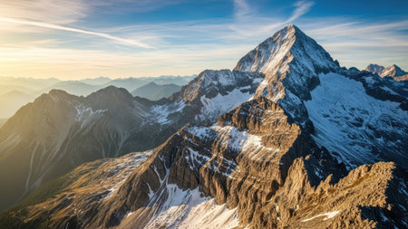 Beautiful panoramic sunrise view of mountain range with peaks. Austrian Alps. Postcard concept. Picture contains blue and orange colours.