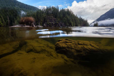 Over and Under picture of a beautiful nature landscape at Buntzen Lake, Anmore, Greater Vancouver, BC, Canada. Taken during a cloudy spring day.