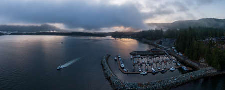 Aerial Panoramic View of a small secluded town on the Pacific Ocean Coast during a cloudy summer sunrise. Taken in Port Renfrew, Vancouver Island, BC, Canada.