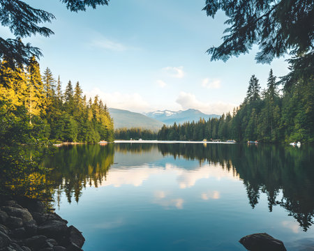 In the morning light a serene landscape unfolds, where the tranquil lake reflects the majestic mountains and their enchanting surroundings, creating a scene that feels both timeless and magical