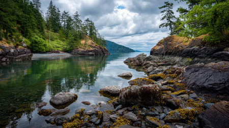 Explore a serene coastal landscape featuring rocky shorelines, lush trees, and tranquil waters. Experience the beauty of nature in a peaceful setting perfect for relaxation.