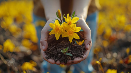 Close-up of woman hands holding yellow spring flowers in the garden