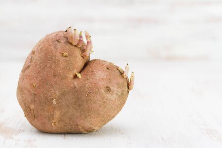 Sprouted potatoes on an white wooden rustic table