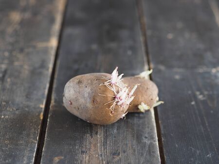 One sprouted potato tuber on a wooden background. Copy space.