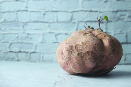 Single Jicama fruit in brown color,placed on brown wooden background